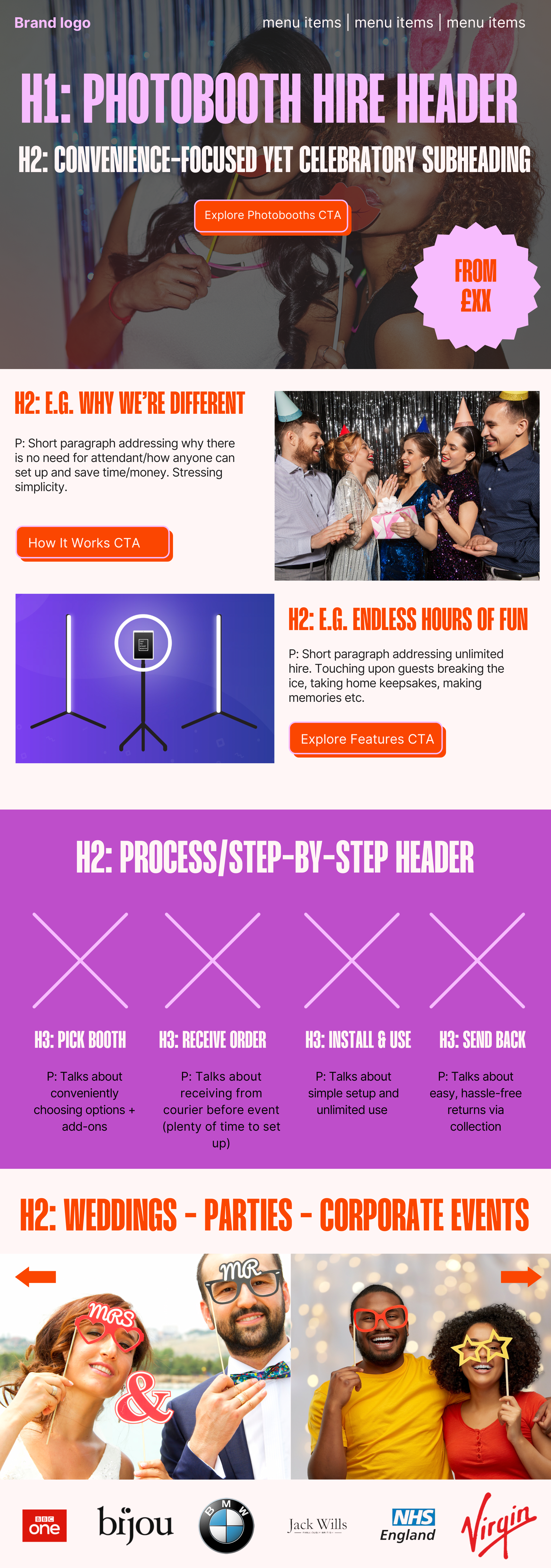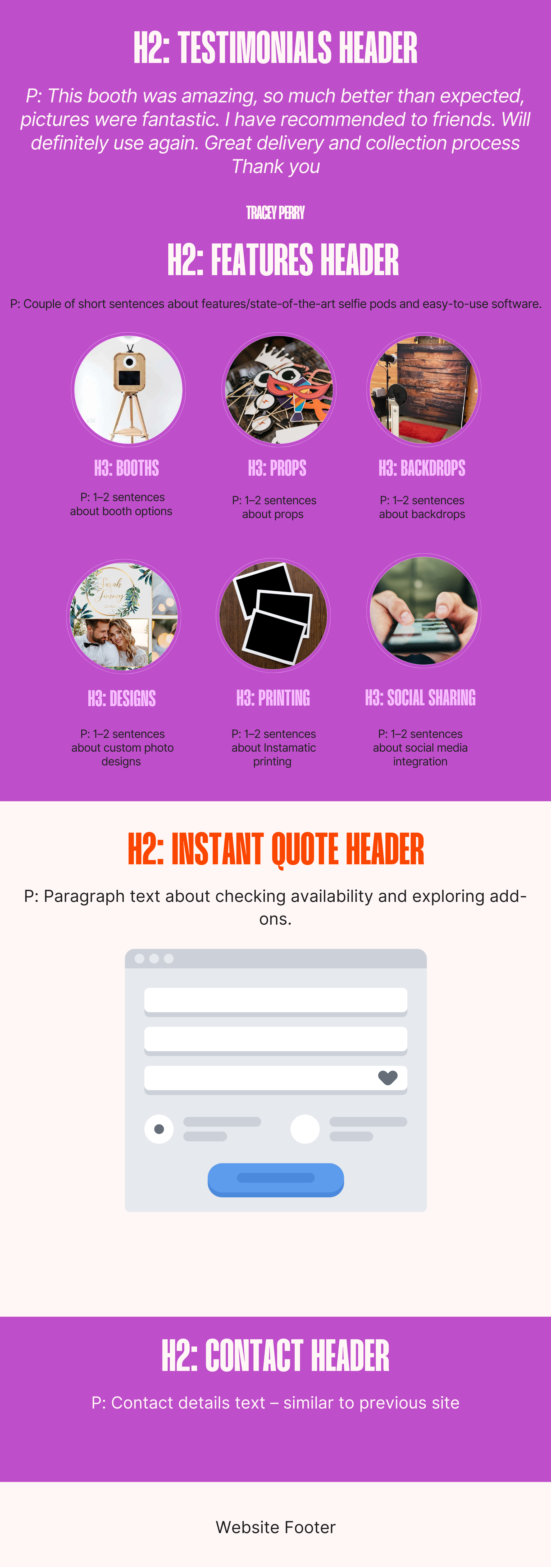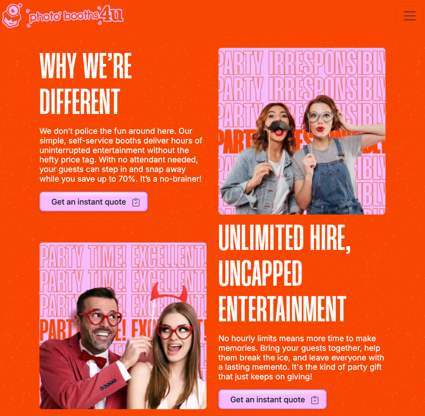 Photobooths 4U provide rentable photobooths for parties, weddings and big events. They approached me during a brand refresh, requesting fresh, all-in-one conversion-focused landing page copy designed to showcase their product offering and encourage instant quotes.