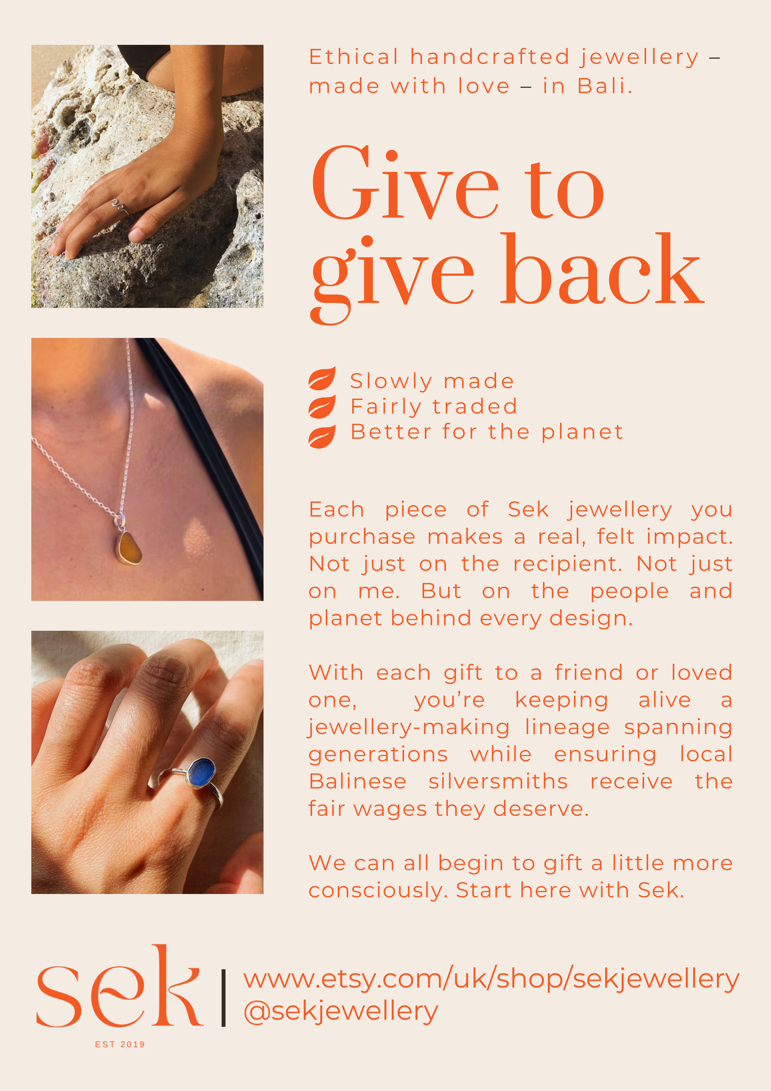 Sek is an independent sustainable jewellery brand set up by talented solo entrepreneur Susie Sek. Susie sells beautiful, slowly made rings and necklaces crafted by local artisans in Ubud, Bali. Susie came to me wanting some simple print materials that she could use to promote her brand at a conscious gifting event in London. As a result, I designed a selection of contemporary flyers with bespoke copy that she was able to use to raise brand awareness and display on her stall.